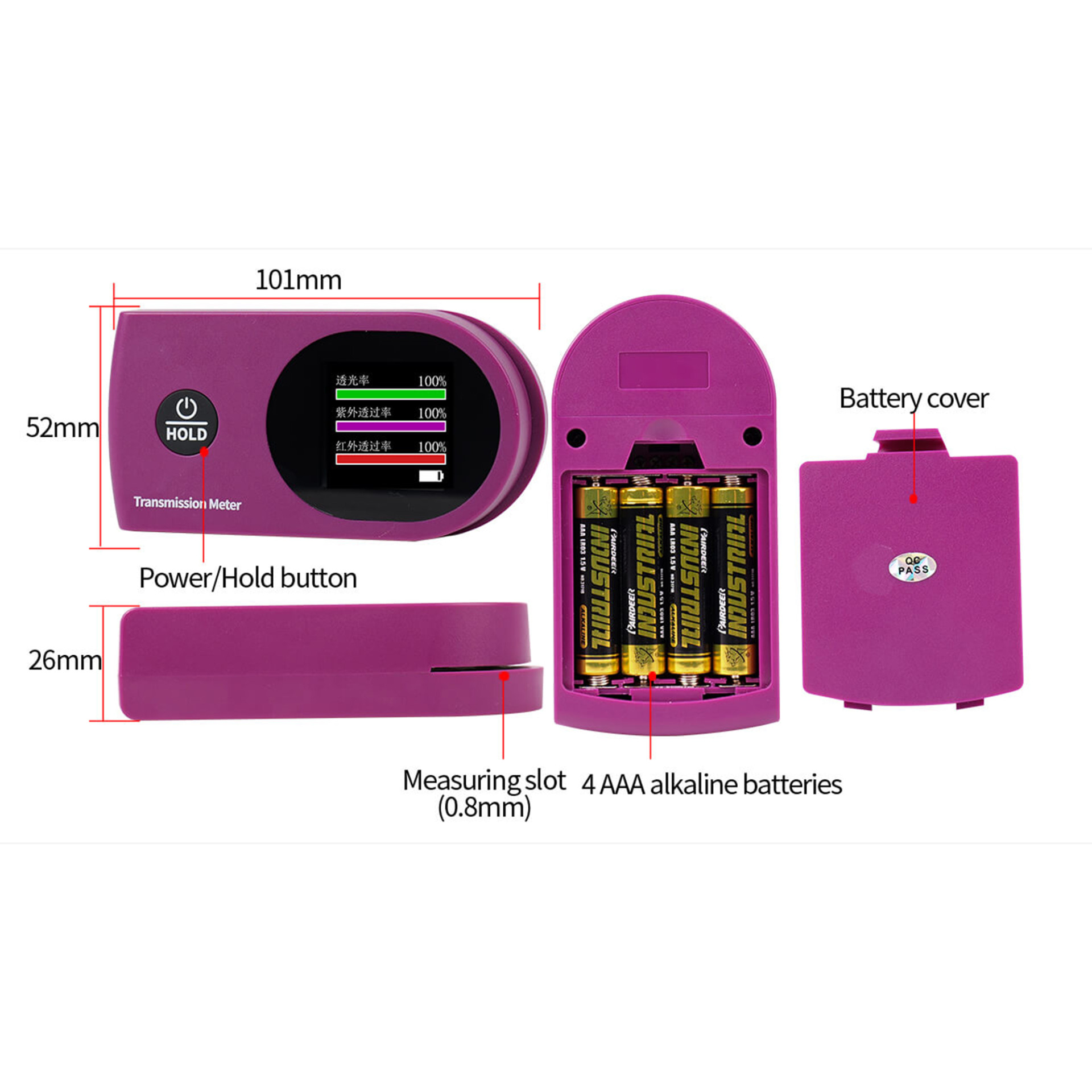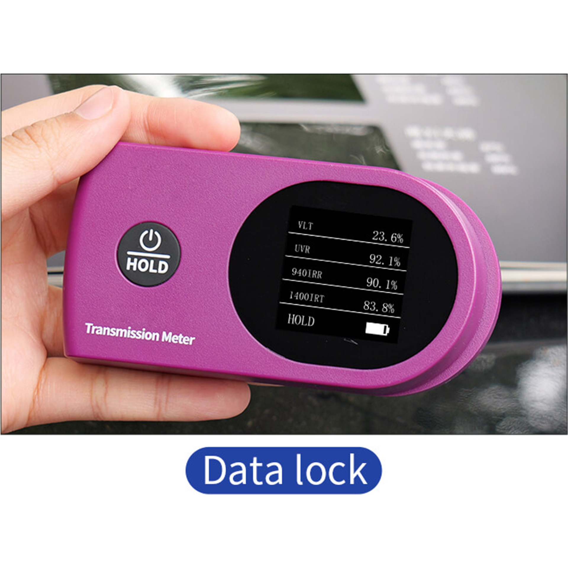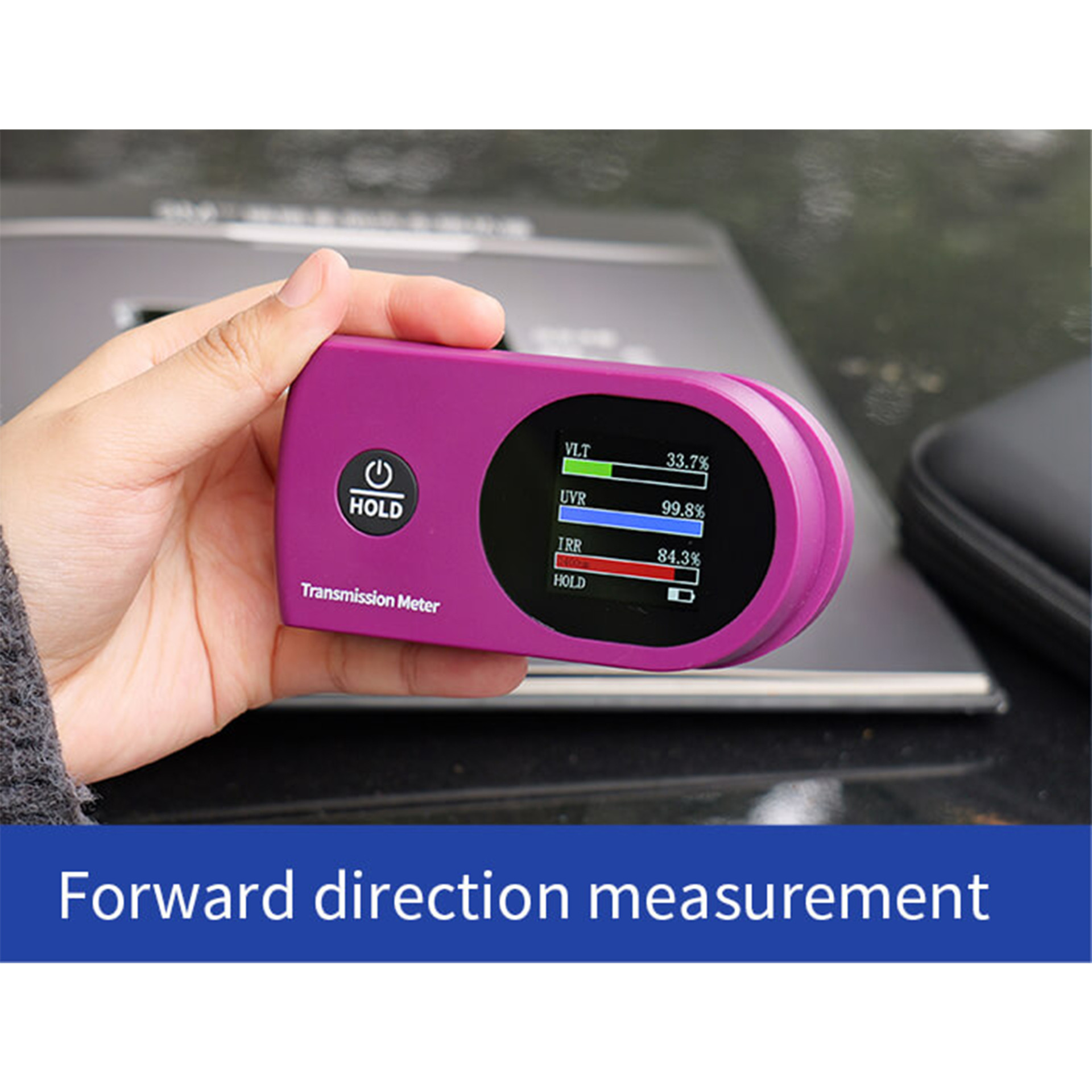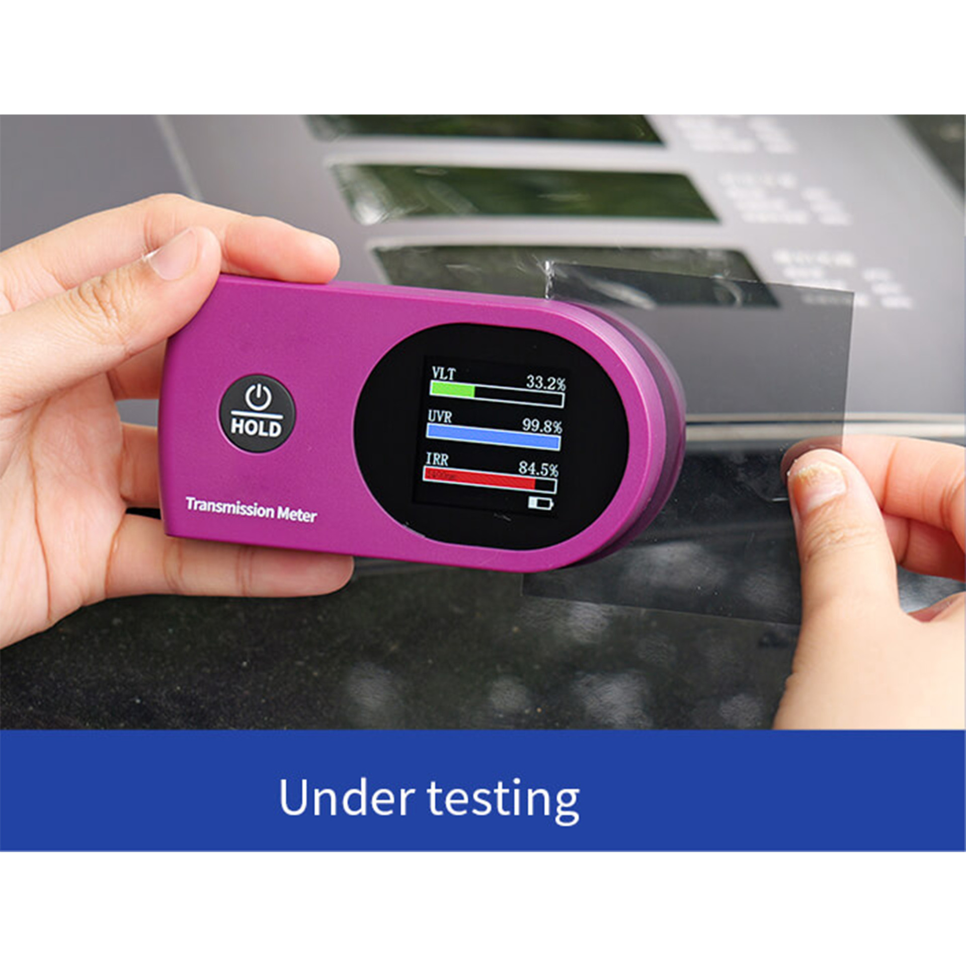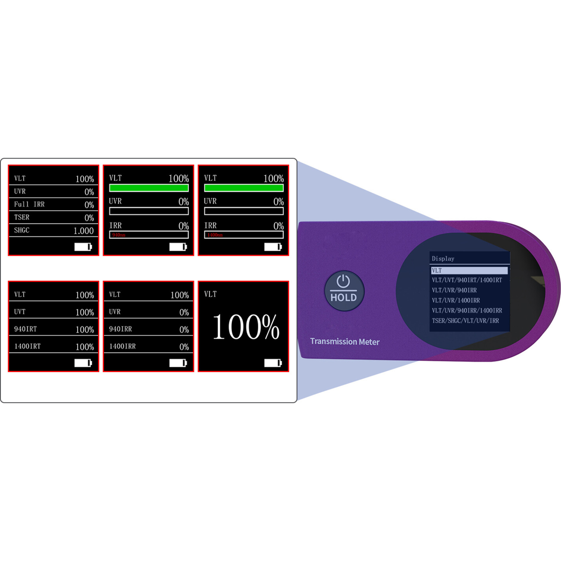 1. It is a compact and portable transmission meter. It allows for simultaneous testing of infrared and ultraviolet rejection, visible light transmittance, Total Solar Energy Rejection (TSER), and Solar Heat Gain Coefficient (SHGC) across various film types, including solar control and safety films. The device supports multiple display configurations, enabling users to customize the data view to their specific needs.
