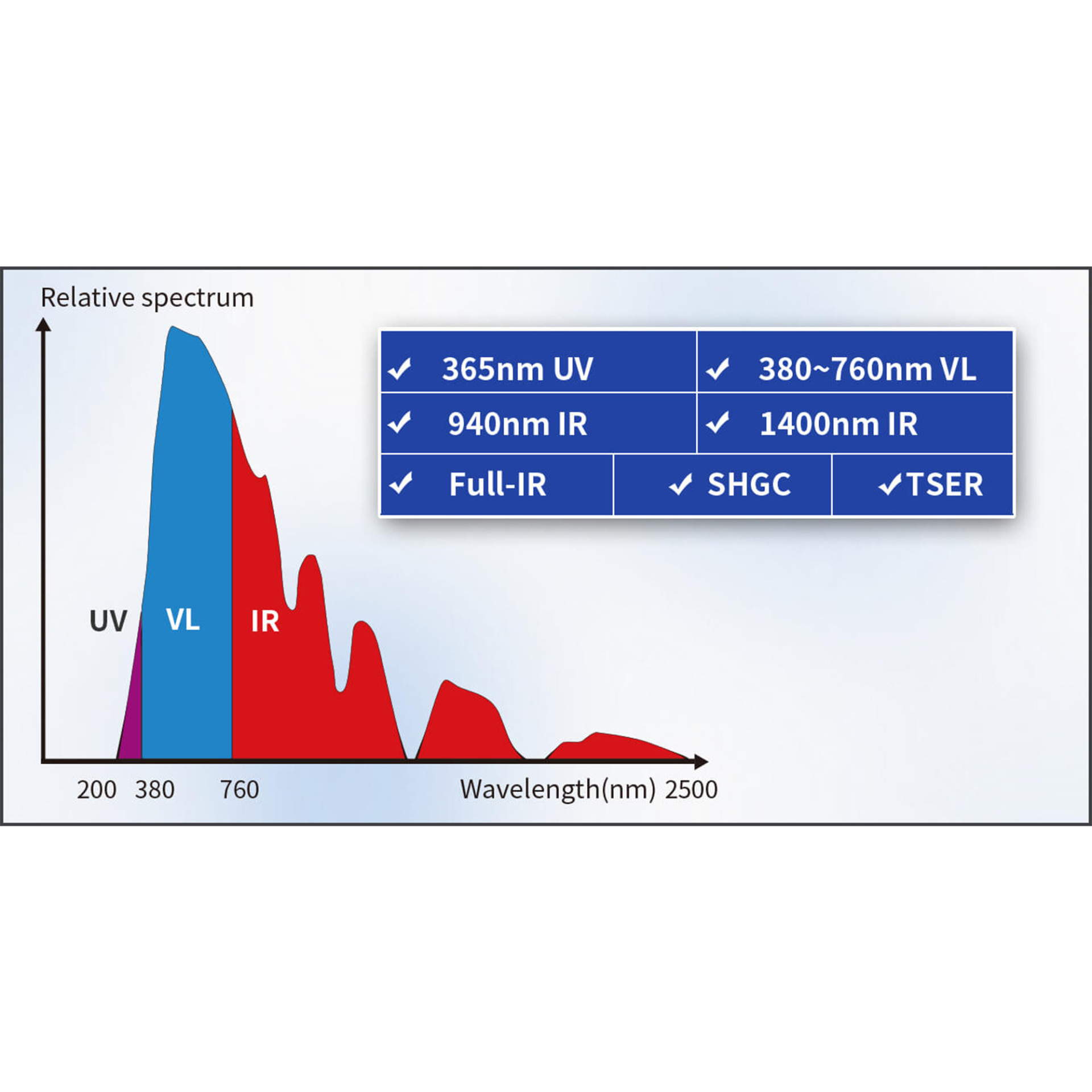 2. Measure Seven Parameters: UV, Visible Light, IR 940nm, IR 1400nm, Full IR, TSER, SHGC