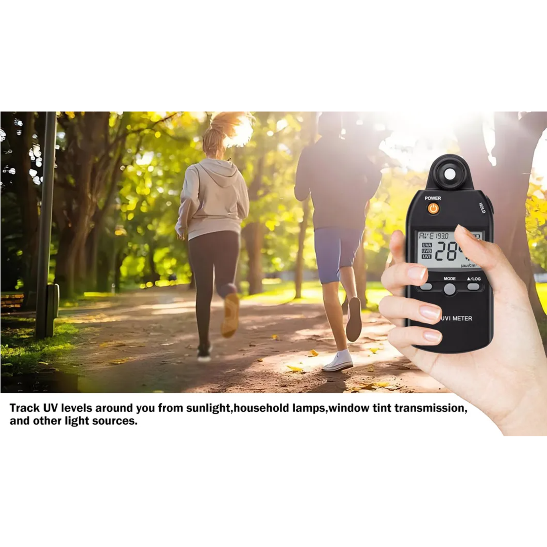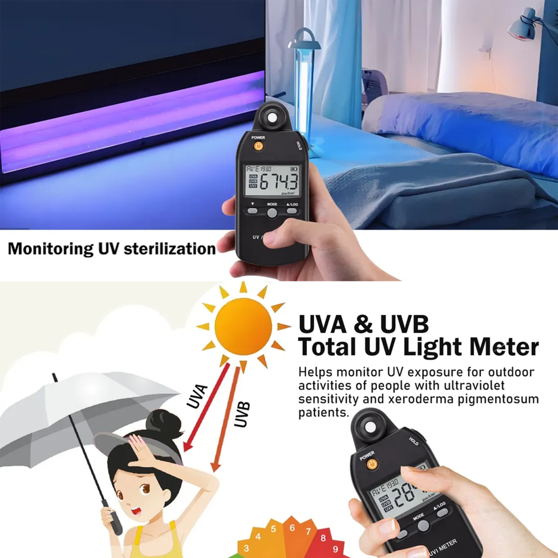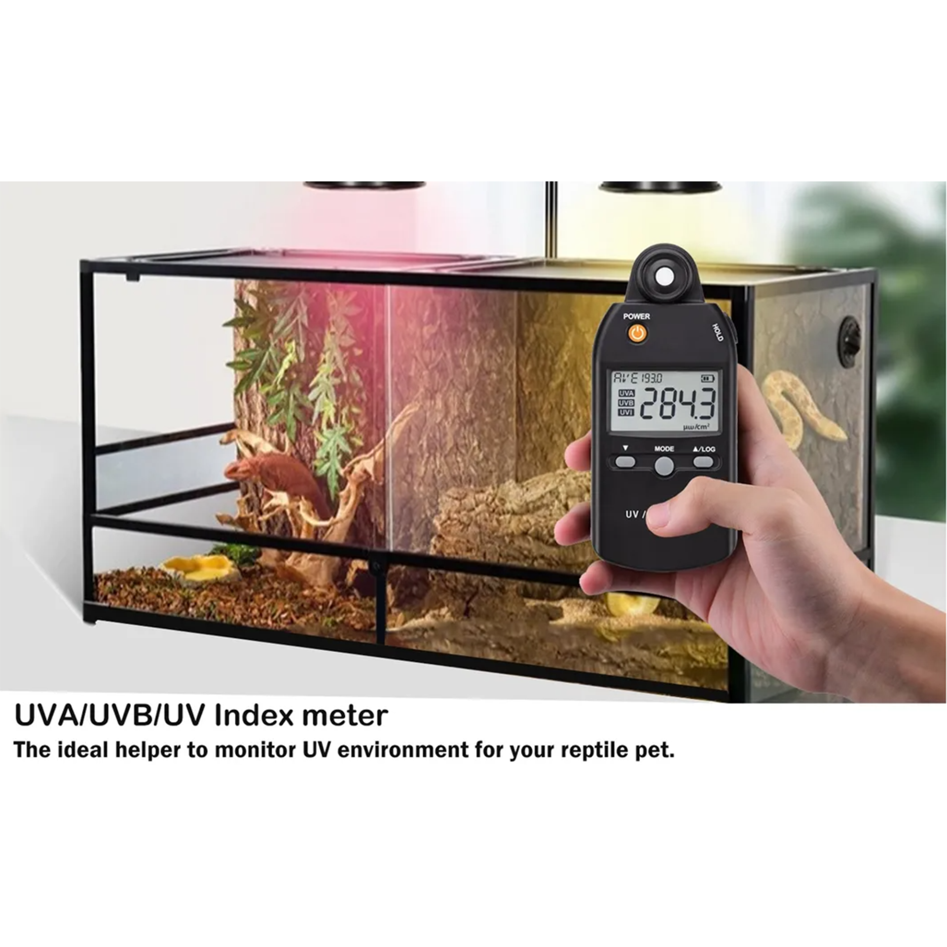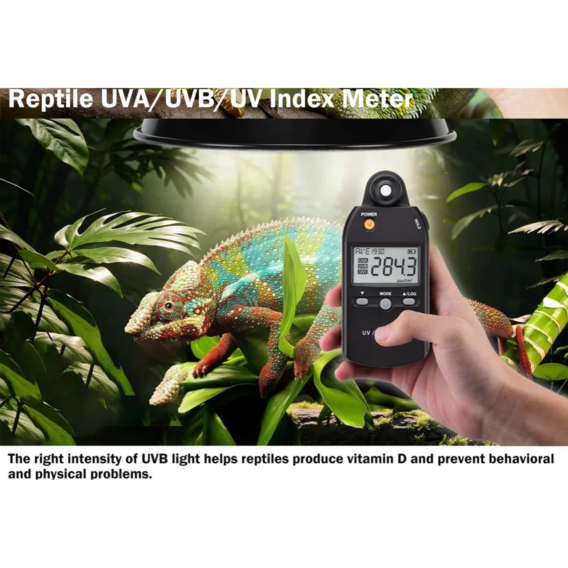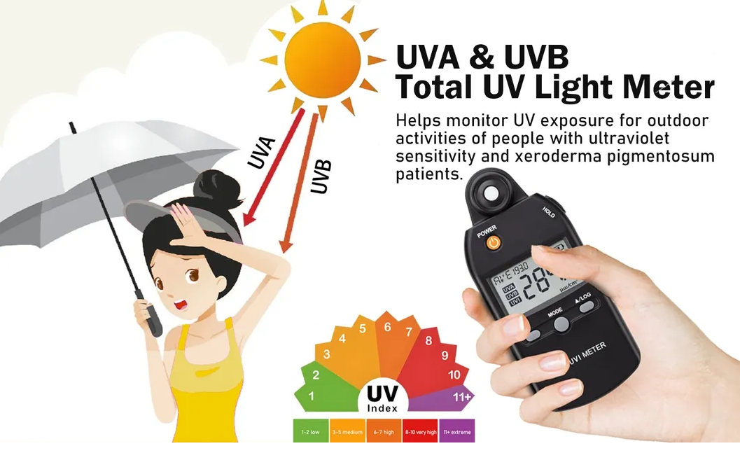 UVA and UVB light are natural components of sunlight, and too much UV light exposure can lead to serious skin conditions.Use this meter to check UV levels to decide when it's best to do outdoor activities.The right intensity of UVB light helps people and animal produce vitamin D.